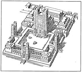 (afb. 1 Het te bouwen tempelcomplex dat, naar men gelooft, nog eens werkelijkheid wordt, heeft men zich ongeveer als hier voorgesteld. Veel fantasie is nodig geweest, omdat Ezechiël slechts een grondtekening was voorgesteld.)